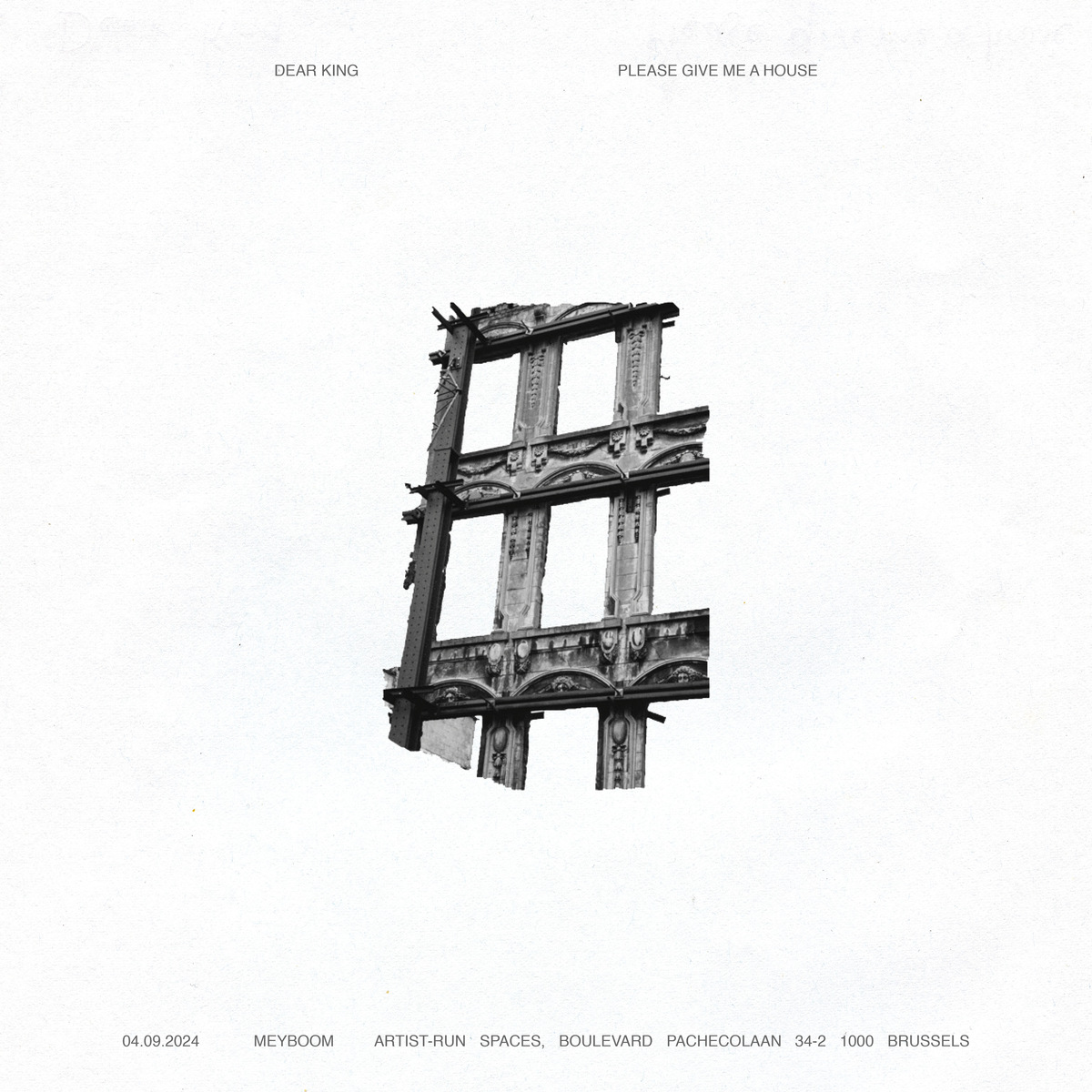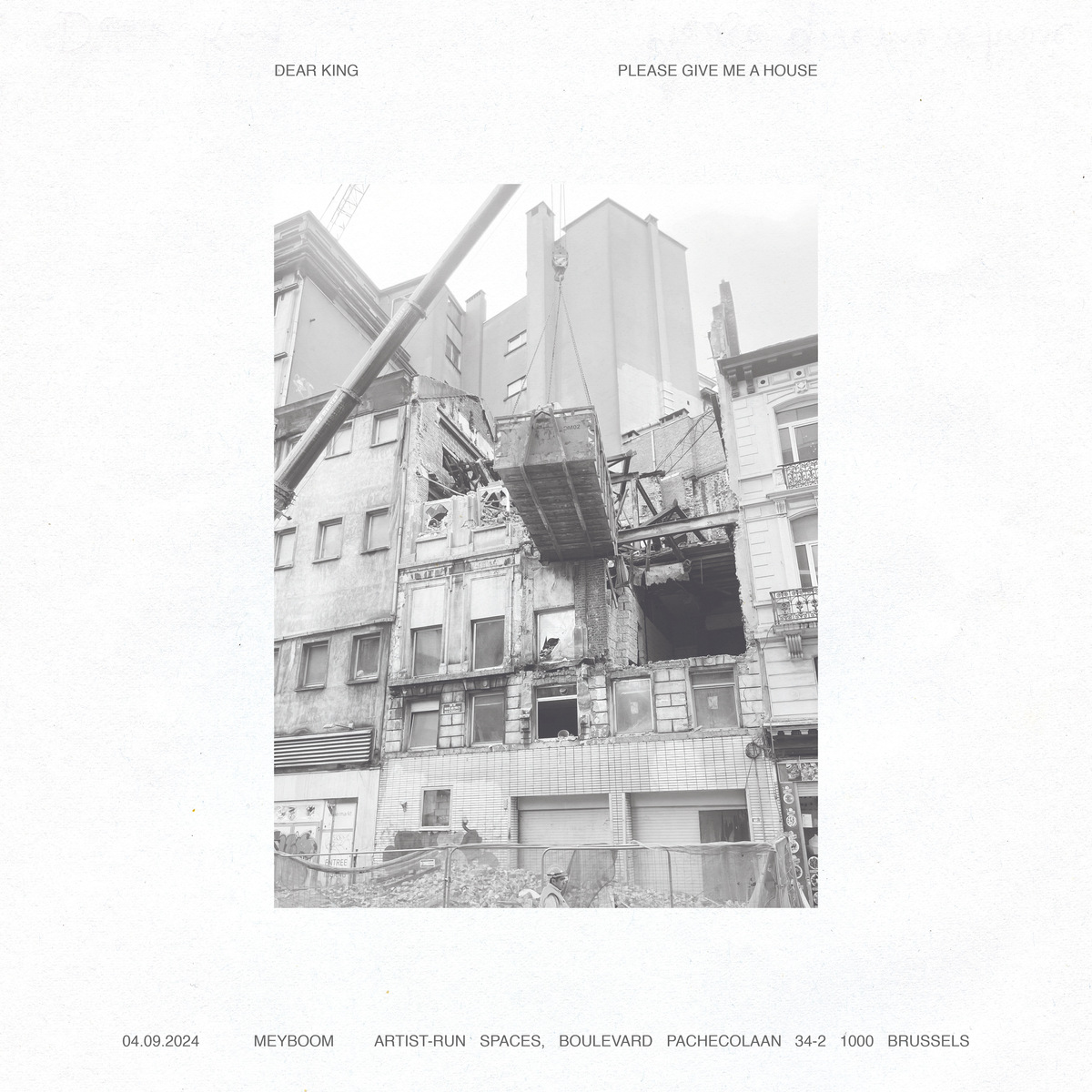Dear king, please give me a house. Poster by Stéphanie Petitjean, photo by Jesse van Winden, showing the former Actiris headquarters in process of demolition. This used to be the location of Jubilee's offices, as well as that of around 150 artists studios, for 3 years.