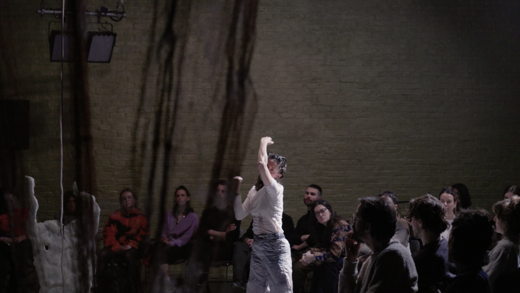 "Pendant ma résidence à Meyboom, j'ai travaillé sur le texte et la chorégraphie du spectacle The River and The Devil, qui a été créé en février 2025. J'ai utilisé cet espace comme salle de répétition, principalement seule, mais j'ai également reçu à différents moments la visite des conseillers dramaturgiques David Weber-Krebs, Simon Asencio et Louise Vanneste." Combinant danse, fiction et narration collective, la pièce évoque le sentiment de vivre parmi les ruines, en posant la question de ce qui reste lorsqu'une rivière disparaît. Les figures mythologiques et les esprits qui protégeaient autrefois la rivière persistent comme des échos dans cette méditation obsédante sur la perte et la persévérance. Plus d'informations sur le projet ici.